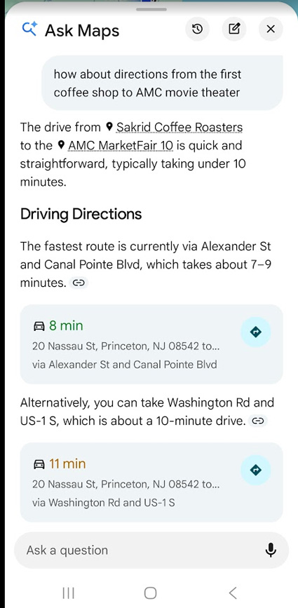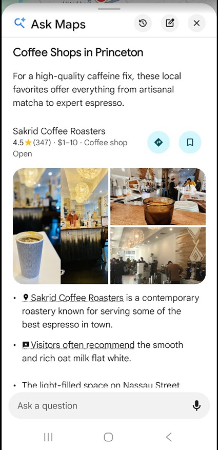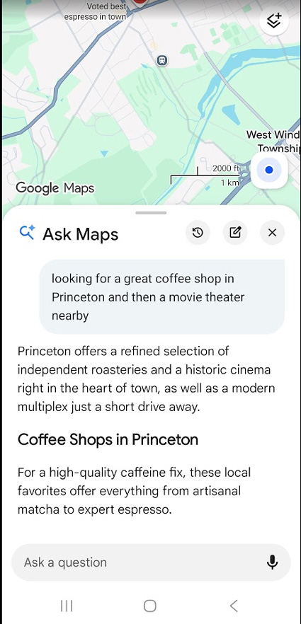 I asked for coffee and then a movie. So “Ask Maps” starts with coffee recommendations in Princeton: