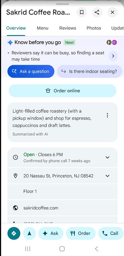 When “Ask Maps” returns results, you will see local listings, an AI overview-like response, links to reviews, links to websites, and more. The results are packed with helpful information. In addition, you can obviously find directions easily based on what you choose to do. Hey, it’s Google Maps… And once you visit a local listing, you will find all of the information you would normally find like menus, reviews, photos, hours, the newish “Know before you go” AI feature with information sourced from reviews, and more. You can also make reservations, order online, etc., like you normally could do.