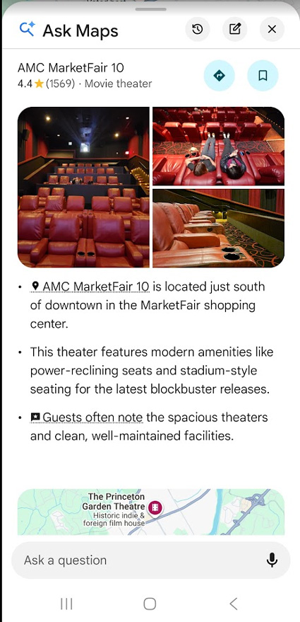 “Ask Maps” then switches to providing movie theatre recommendations since that was part of my initial query: