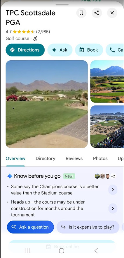 Again, tapping into local listings brings up familiar elements when researching local businesses (including the newish “Know before you go” AI element, which is sourced from user reviews):