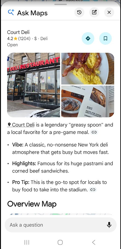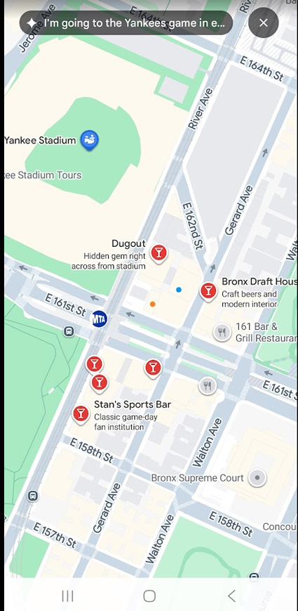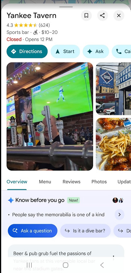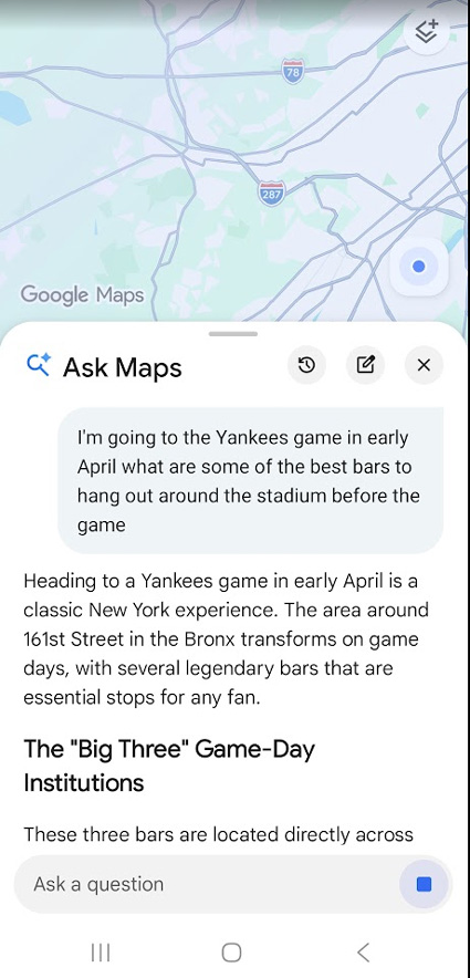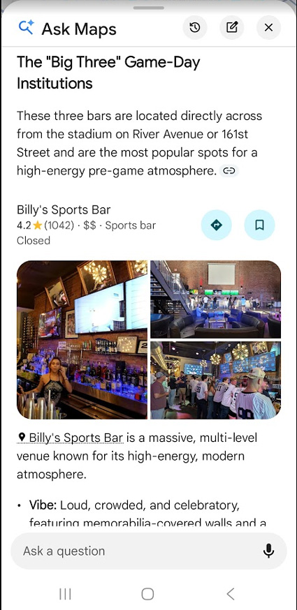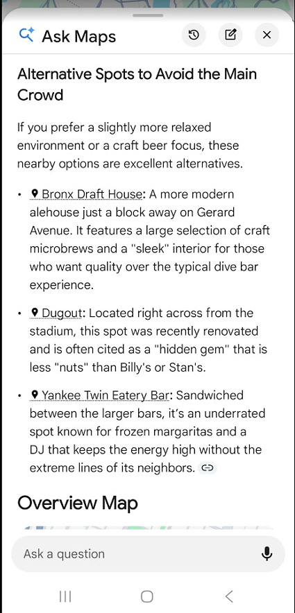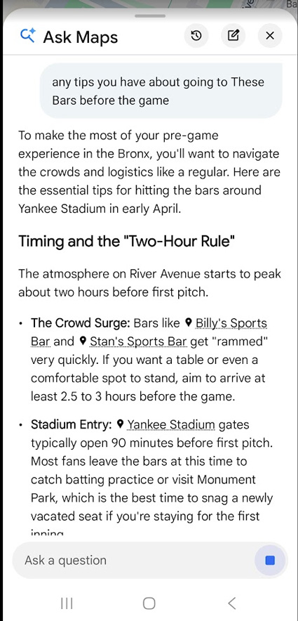 And since “Ask Maps” is conversational, I wanted to get some tips about attending the bars before the game. Gemini provided some additional information: