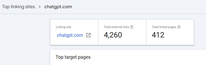 Well, I was recently auditing a large-scale site and digging into GSC as part of the initial analysis. I hit the links reporting in Search Console, which can sometimes yield interesting findings… After scanning the top linking domains, I noticed a very interesting site. It was ChatGPT. My first reaction was, wait, why in the world is that there? But it all made sense once I clicked into the listing to view the links pointing at my client’s site. They were shared chats.