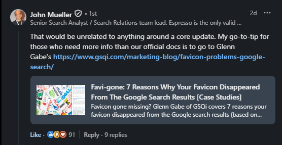 No, broad core updates don’t impact favicon visibility. Google’s John Mueller just confirmed again that broad core updates would not be the reason your favicon disappears from the search results. I totally agree with John and I have explained that before as well. Although broad core updates can have a huge impact on rankings, they would not remove your favicon from the SERPs. Instead, there’s probably some technical or policy issue causing the problem (which I have covered heavily throughout this post.) Also, very cool to see John recommend reading my post when troubleshooting favicon problems. :)