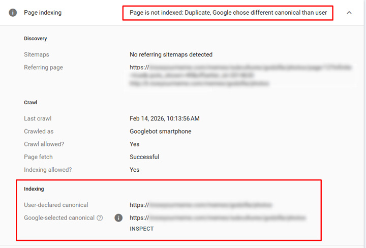 And here is the url in GSC showing that Google is ignoring rel canonical and canonicalizing to the other url (the one ranking in Google AND ChatGPT).