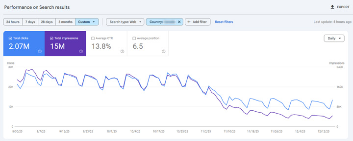 I mentioned a bonus case study earlier in this post, and it’s a good one. I have a client with a large-scale site (50M+ urls) that uses hreflang targeting two countries, but the content is in the same language. In the past, Google has chosen to index both versions of the urls even though it contained the same content in the same language… until August. Then on one day, Google’s systems chose to canonicalize millions of urls to the other version (all located on the core part of the site directory-wise). I’ll explain how GSC handles canonicalized urls soon from a clicks and impressions standpoint, but this is the drop we saw when checking the directory property (and isolating the country being targeted). Don’t worry, there’s some Google trickery going on there.