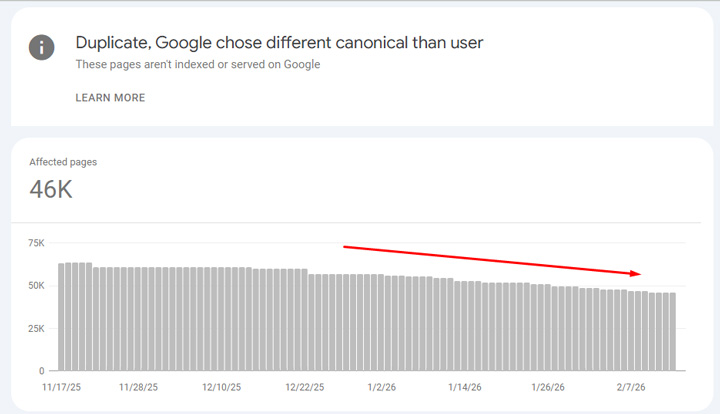 So, Google had the canonicals switched for whatever reason. Seeing this in action and the amount of users going to the wrong urls from the serps, my client started working on cleaning up the situation and making sure the correct urls could be indexed. For example, since the secondary urls are really for users once on the site, and not for Search, noindexing those urls could be a valid approach. Rel canonical alone was not cutting it and my client does not want users seeing those urls in the SERPs or visiting them from the search results. You can see the number is dropping in GSC now, which is great.