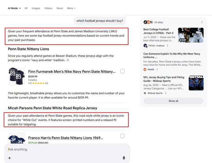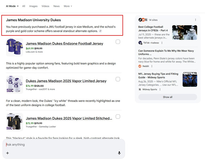 Then I asked AI Mode to recommend some football jerseys for me to buy. Based on my history, it was spot-on. “Go Dukes” and “We are”.