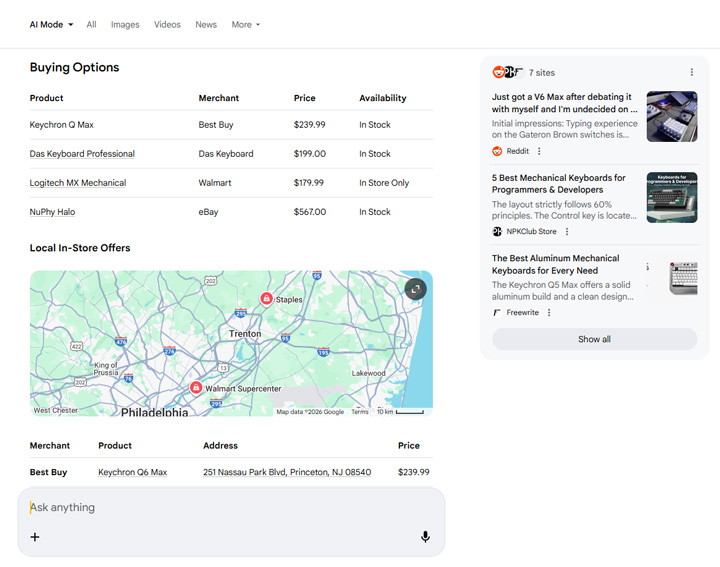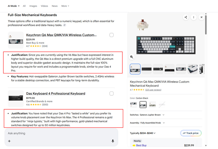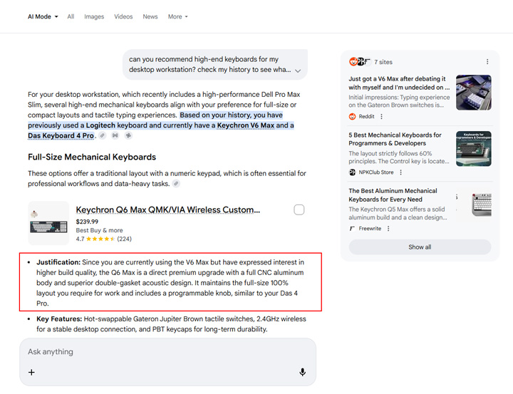 Let’s switch to AI Mode now. Remember, Google rolled out Personal Intelligence in AI Mode soon after the original announcement about Gemini. First, I asked for keyboard recommendations based on my history. Hey, I type a lot and keyboards are important. :) Check the three screenshots below and the justifications. I’ll cover the Personal Intelligence icons after the examples.