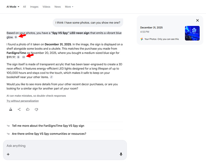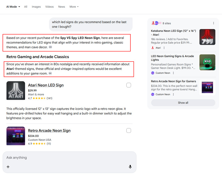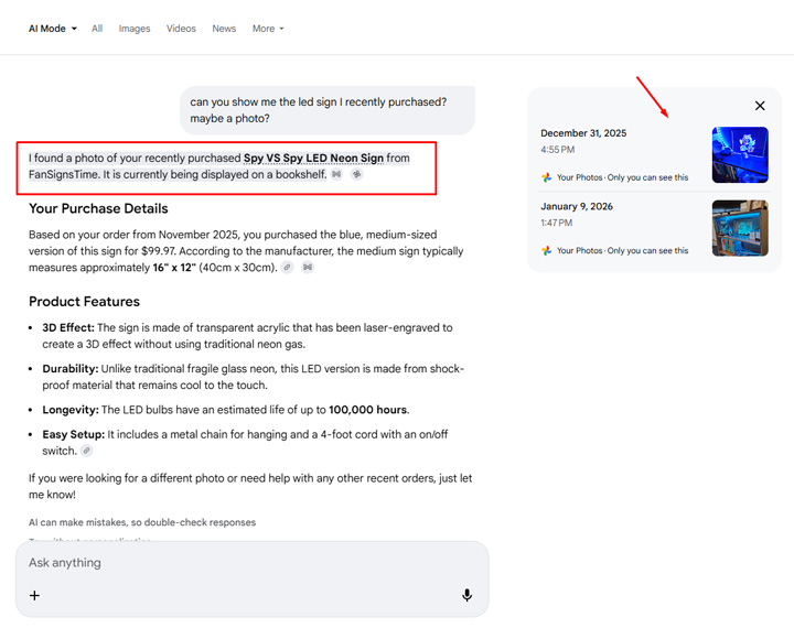 And the final example I’ll provide is asking AI Mode to recommend some led signs based on the last sign I purchased. It nailed it and provided the photo I took as well.