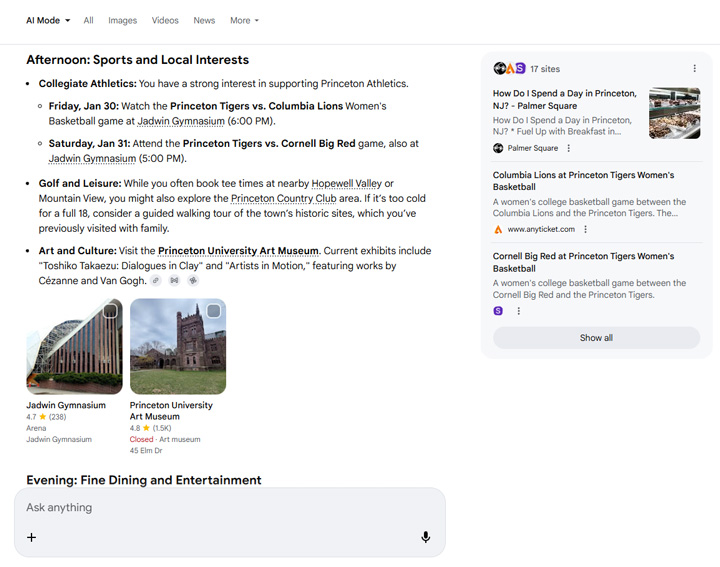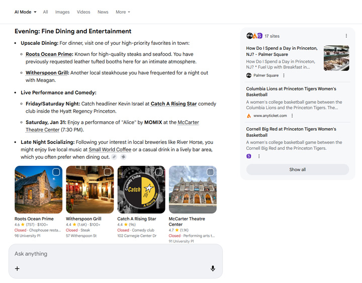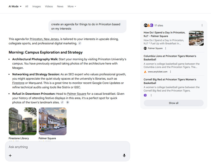 Then I asked AI Mode to create an agenda for things to do in Princeton based on what it knows about me. Sounds like a pretty good day to me. Palmer Square, Princeton sports, and then a great place for dinner (again, based on what it knows about me). It knows those are some of my favorite restaurants.