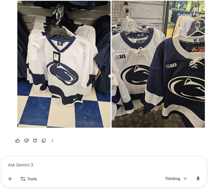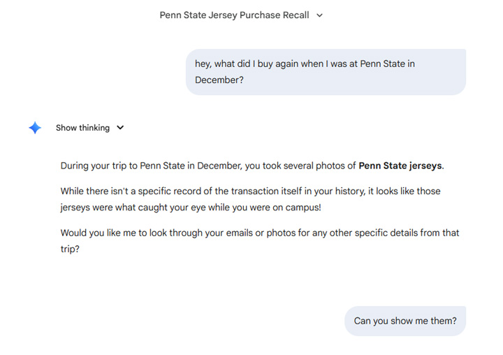 First up, I asked Gemini for some help remembering what I bought at Penn State the last time I was there. I just wanted to see if it could figure that out. Yep, it did.