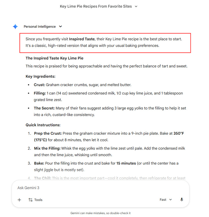 I’ll cover more about this below, including examples of Personal Intelligence in action, the impact to SEO, AI Search, and to anyone attempting to track visibility and performance in AI Search. Spoiler alert! It’s going to be hard… very hard.