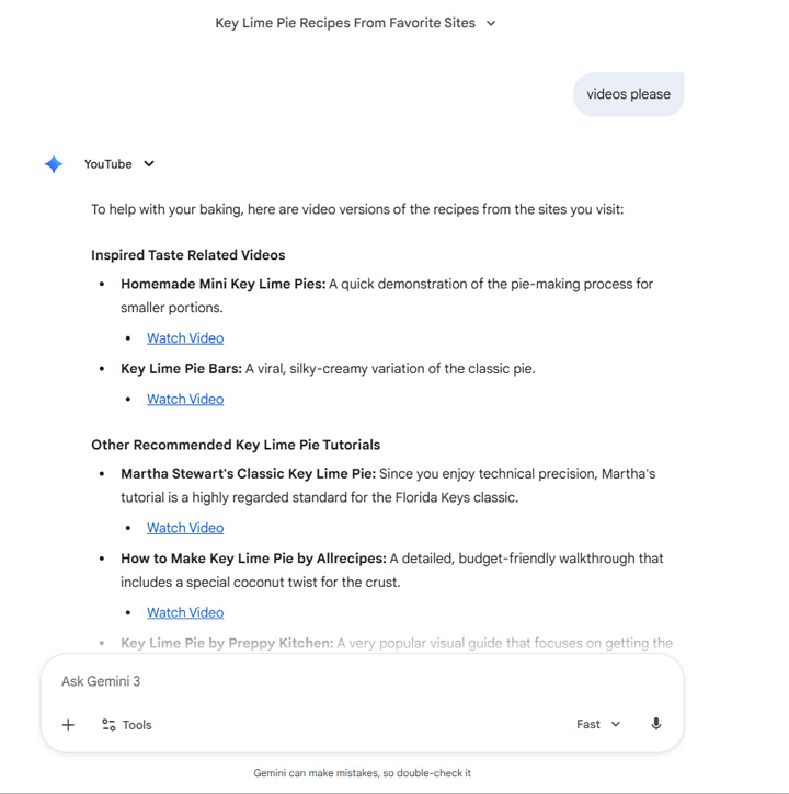 Next up, how about recipe recommendations… and Gemini knew that I visit Inspired Taste often (Hi Adam!)