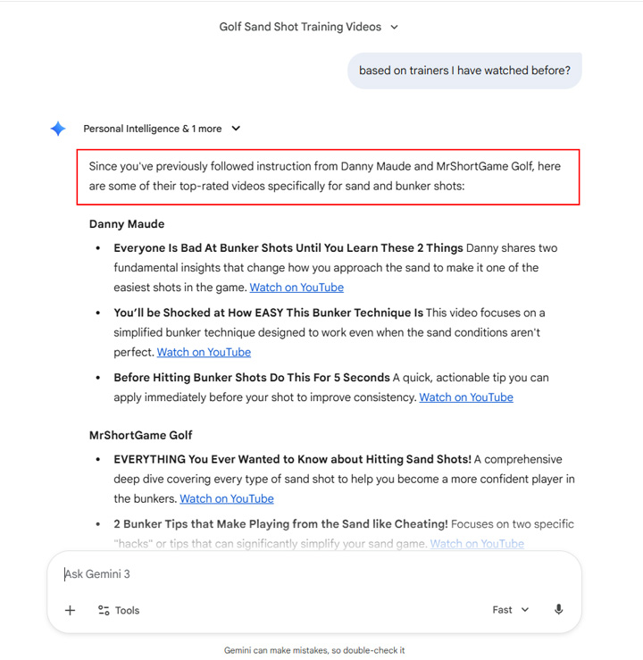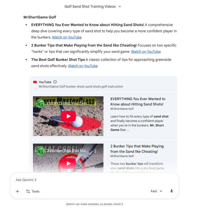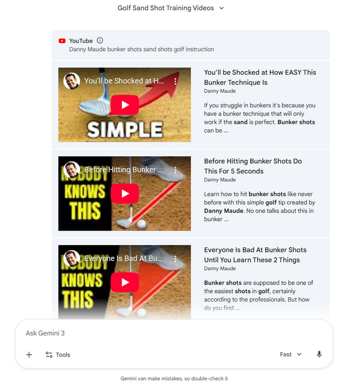 On the topic of sports, I then asked Gemini for some golf bunker shot training videos from trainers I have watched before on YouTube. Yep, it knows the two that stand out, especially for short-game training.
