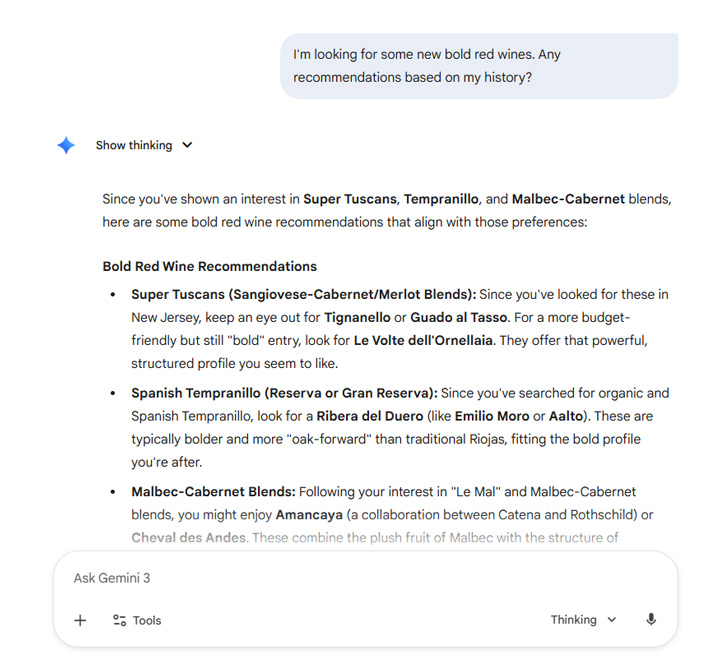Gemini can recommend products and services for you based on what it knows about you. Again, super powerful.