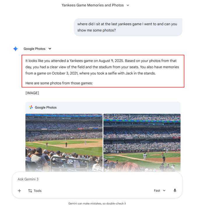 Sorry, more sports. I asked Gemini where I sat at Yankee Stadium the last time I went to a game. Yep, it knew and provided my photos. Great game by the way, the Yankees won and beat the Astros. :)