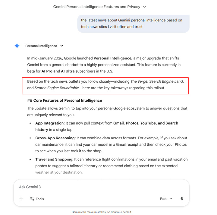 How about the latest news on a topic based on my favorite publications. Gemini did that well too. And if you’re a publisher out there, a big heads-up that personal intelligence could impact visibility of articles depending on what it thinks the user’s favorite publications are.